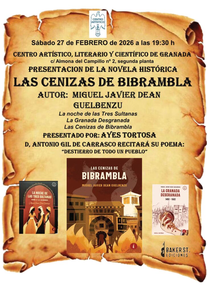 El próximo sábado 27 de Febrero de 2026 a las 19:30h en el «Centro Artístico, Literario y Científico de Granada». El autor Miguel Javier Dean Guelbenzy presentará el tercer libro de su trilogía sobre la historia de Granada. Continuación de «La Noche de las Tres Sultanas» y «La Granada Desgranada».
